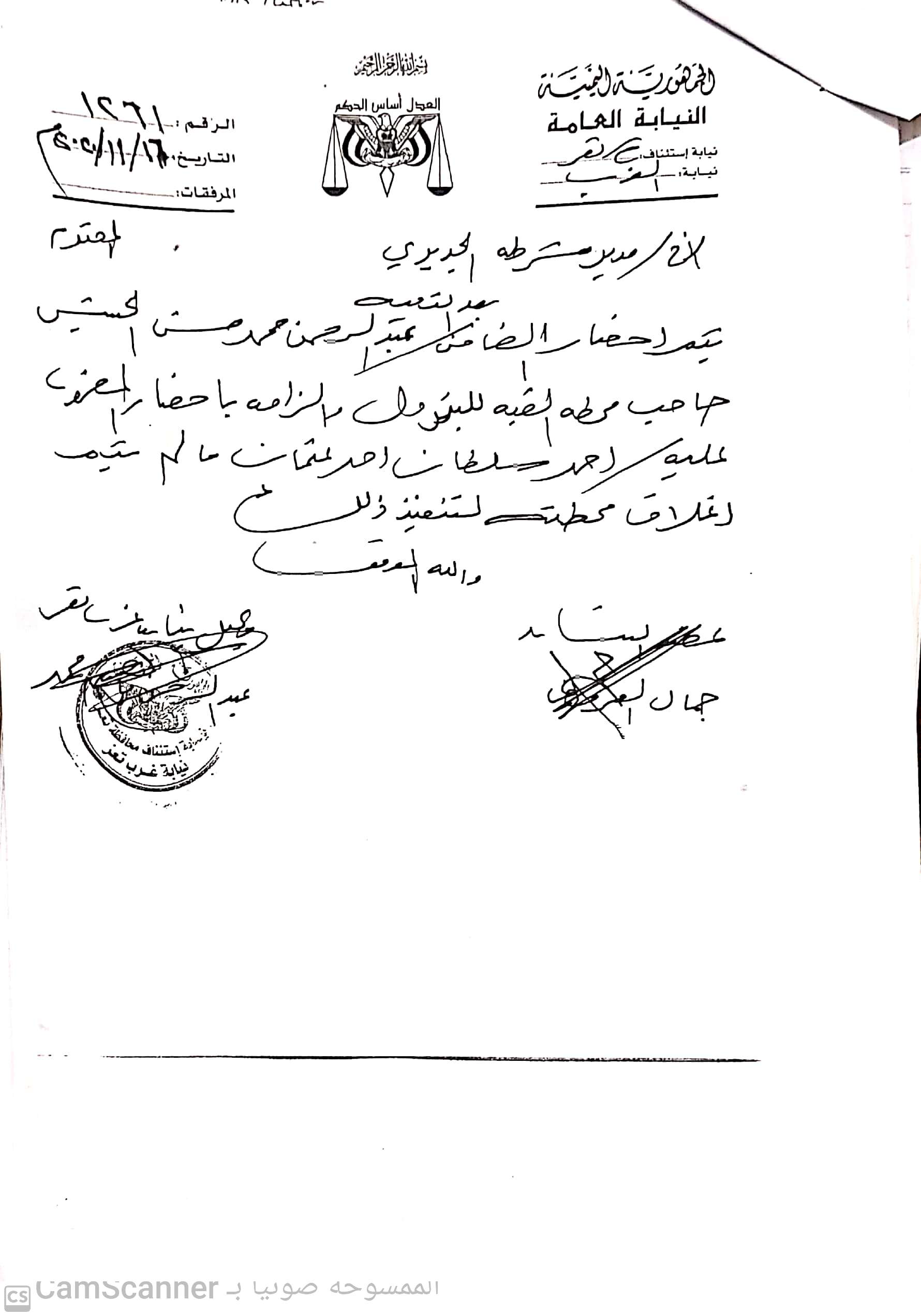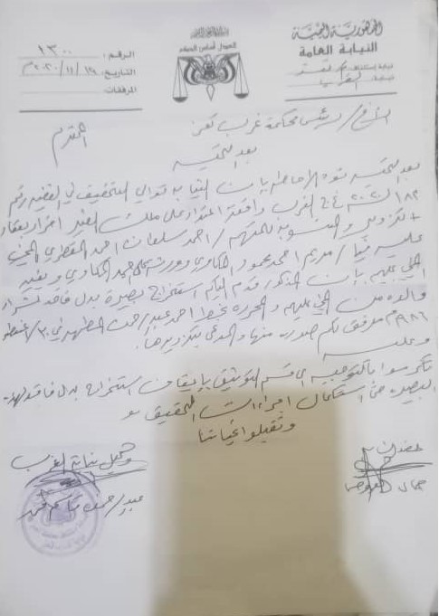 نيابة غرب تعز: من أجل الوصول إلى نتائج بما يتعلق بصحة الوثيقة وجهت خطاب من وكيل النيابة رئيس محكمة الغرب في 19 نوفمبر/تشرين الثاني2020، وطلب منه بتوجيه قسم التوثيق في المحكمة بإيقاف استخراج وثيقة بدل فاقد حتى استكمال اجراءات تحقيقات النيابة.