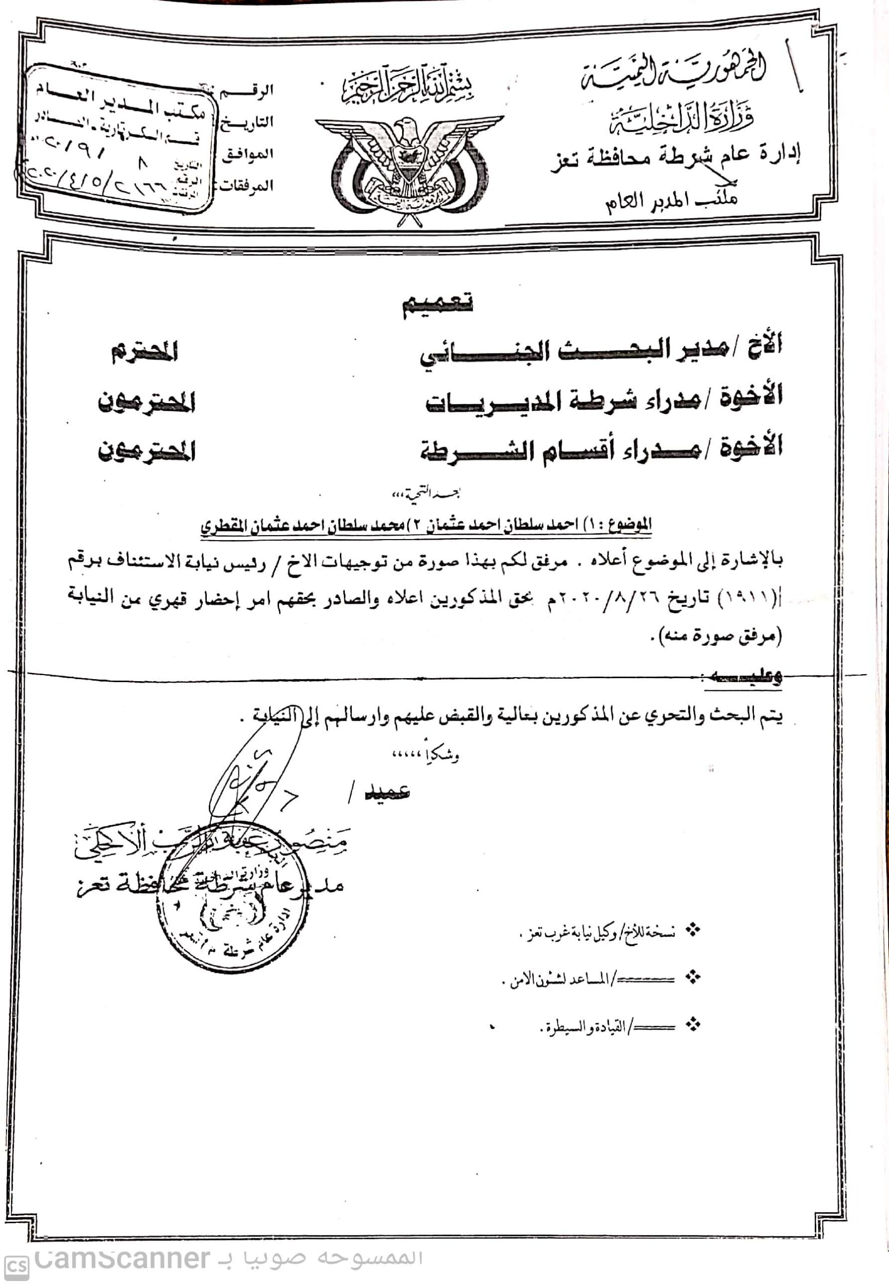 تعميم: في 8 سبتمبر/أيلول2020 أصدر مدير عام شرطة محافظة تعز تعميماً إلى مدير البحث الجنائي ومدراء شرطة المديريات ومدراء أقسام الشرطة للبحث والتحري عن المتهمين في الاعتداء على الأرضية أحمد سلطان أحمد عثمان المقطري وأخيه محمد، والقبض عليهما تنفيذاً للأوامر القبض القهرية الصادرة من نيابة إستئناف تعز. يذكر أن المذكورين كانا في السجن وخرجا بضمانة تجارية مقدمة من محطة البترول الواقعة في حي القبة وسط المدينة والتي يملكها عبدالرحمن حسن، وهو الشخص الذي يحاول شراء الأرضية ويحاول عبر المسلحين فرض سعر أقل من السعر الذي تستحقه، ومن معرض التضامن للسيارات في بئرباشا، لكن الضامن الأول عندما حاول قسم شرطة الجديري في حي القبة إحضاره وفقاً للتوجيهات نيابة غرب تعز، رفض الحضور للنيابة وقال إن محطة البترول الضامنة للعصابة المسلحة تابعة لأحد الألوية العسكرية التابعة للمحور.
